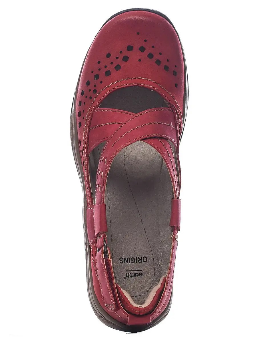 Туфли женские красные из нубука. Кожаная подкладка. Съемная текстильная стелька с супинатором. Спереди сквозная перфорация. Ремешок на липучке. Нескользящая подошва из полиуретана 1,5 см, каблук 3 см. Длина стельки в размере 6,5W- 23,5 см. Обувь импортируется из США. Earth. США.
