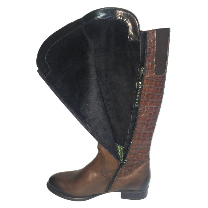 Сапоги женские коричневые кожаные. Текстильная подкладка и шерстянная стелька. По всей длине голенища широкие резиновые вставки. Сбоку молния. Подошва 1 см, каблук 3 см. Высота 40 см, обхват 40 см. Длина стельки в размере 42- 27,5 см, в 43- 28,5 см, в 44- 29,5 см. Remonte, Германия.